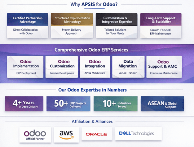 With 4+ years of hands-on Odoo delivery experience, APSIS provides end-to-end ERP implementation, customization, integration, and long-term support for growing enterprises across industries.
